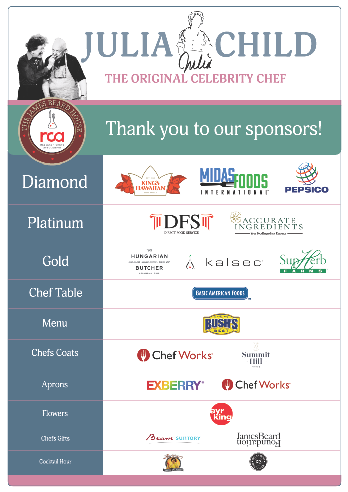 RCA to Honor Julia Child at The James Beard HouseThe Research Chefs Association is proud to present a special event and innovative dining experience honoring Julia Child, entitled “Julia, The Original Celebrity Chef,” will be held October 23-24, 2025, in New York City at the historic James Beard House. This exclusive event will celebrate the culinary talents of RCA members and benefit both the RCA and The James Beard Foundation. We have begun final details and planning for RCA's Julia Child tribute dinner at The James Beard House, this October. Sponsorship opportunities for the event have closed and all tickets have been sold. If you have interest in sponsorship for our dinner in 2026, please contact Chef Jerry McDonald at jmcdonald@midasfoods.com. |